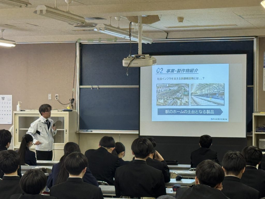 令和7年12月16日、盛岡市立高等学校1年生約100名を対象に、ものづくりの魅力を伝える出前講座を実施しました。講師は同校卒業生の当社品質保証部の部長が務め、当社の仕事や社会インフラを支える製品づくりについて、設計から製造、施工まで一貫して取り組む体系や、実際の事例を交えて紹介しました。生徒の皆さんは真剣に耳を傾けてくださり、ものづくりの面白さや進路選択のヒントを感じていただけたと思います。